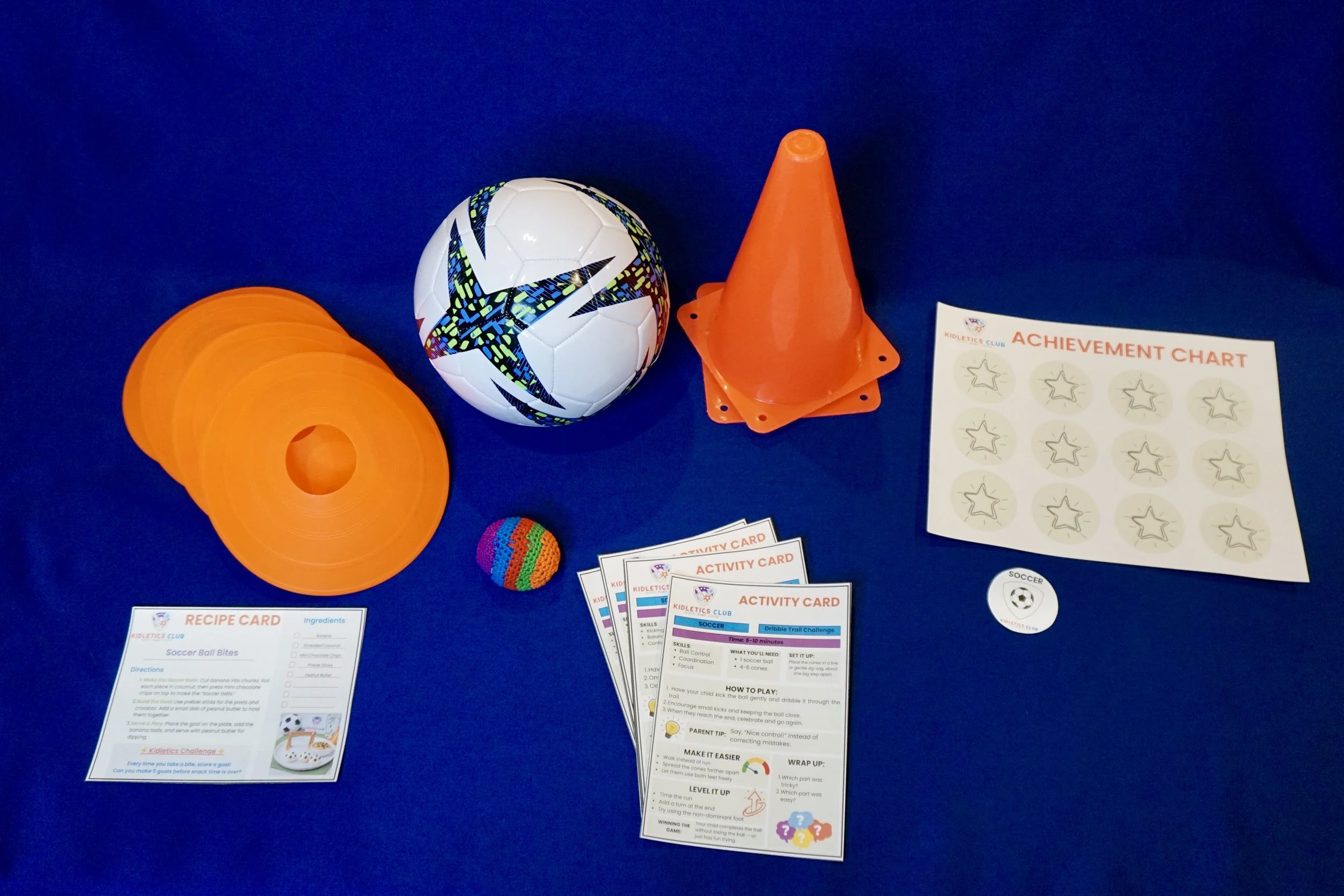 Kid-friendly sports equipment to learn the fundamental skills of each sport, easy parent-led activity cards, a healthy sports-related recipe, achievement stickers, and access to short demo videos + parent coaching tips.